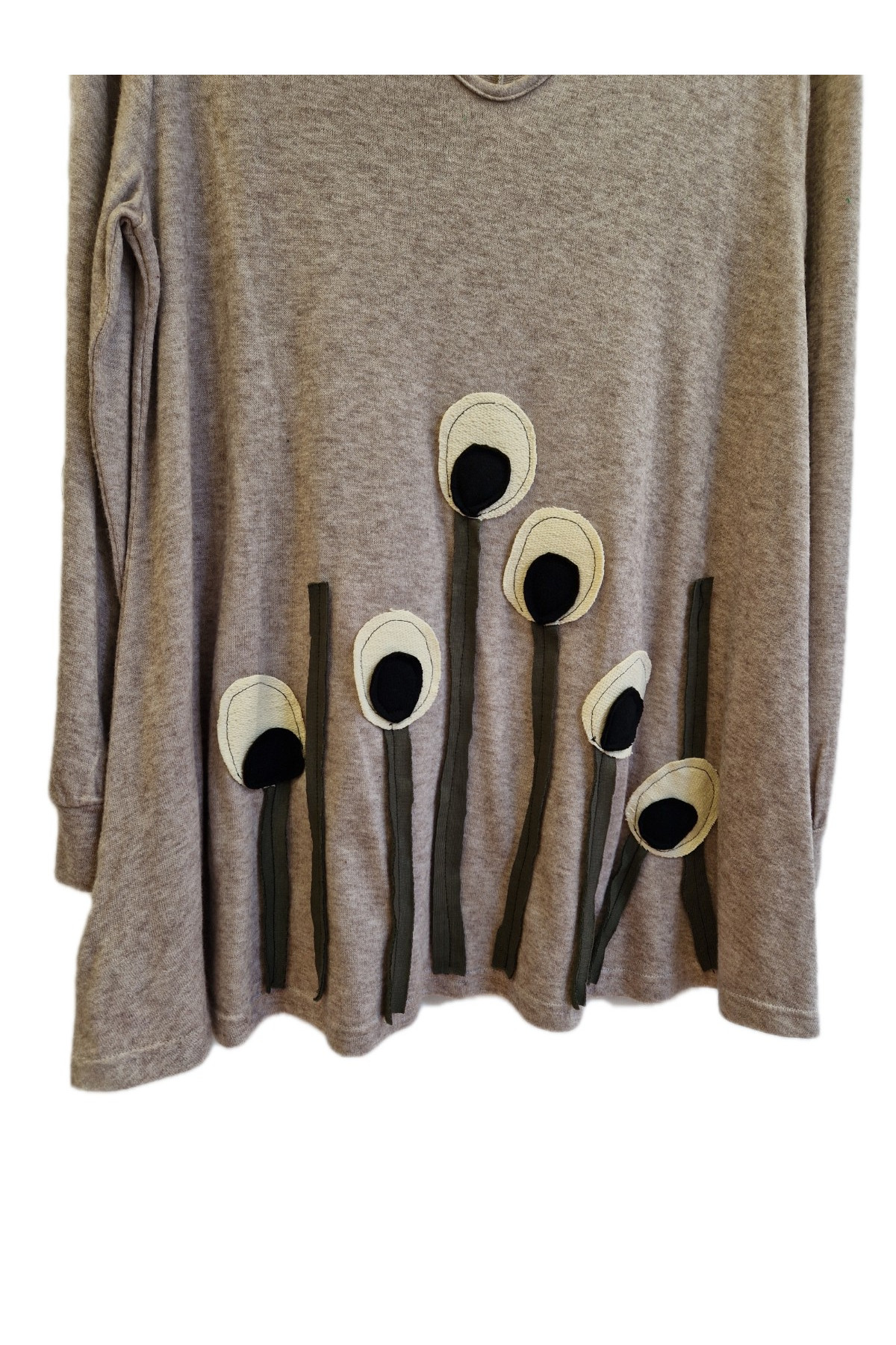 Χειροποίητη ελαστική μακρυμάνικη γυναικεία μπλούζα με απλικέ (patches) παράσταση κατάλληλη για καθημερινές εμφανίσεις. Έχει φαρδιά γραμμή που προσφέρει άνεση και δεν διαγράφει τη σιλουέτα σας.
