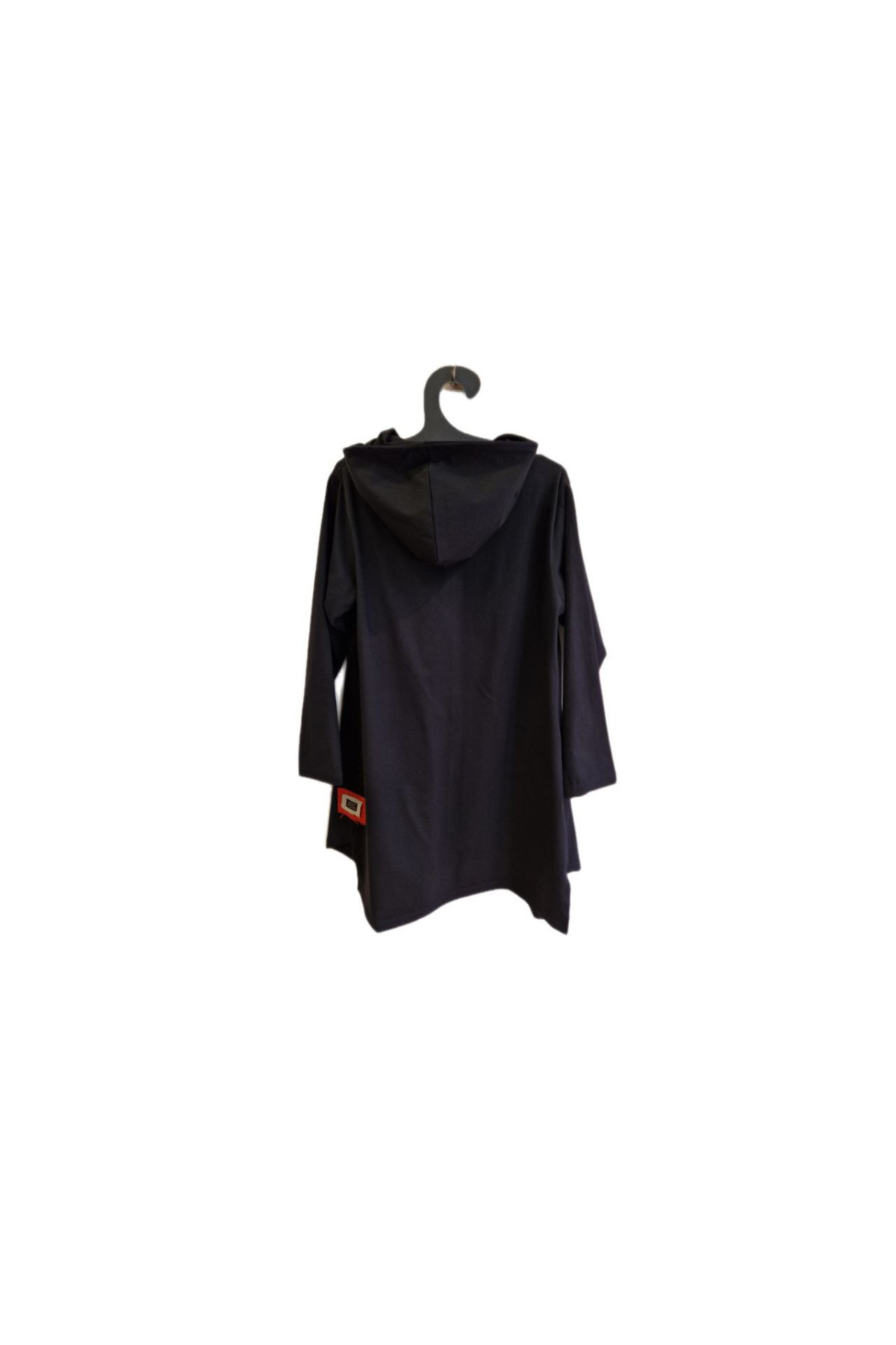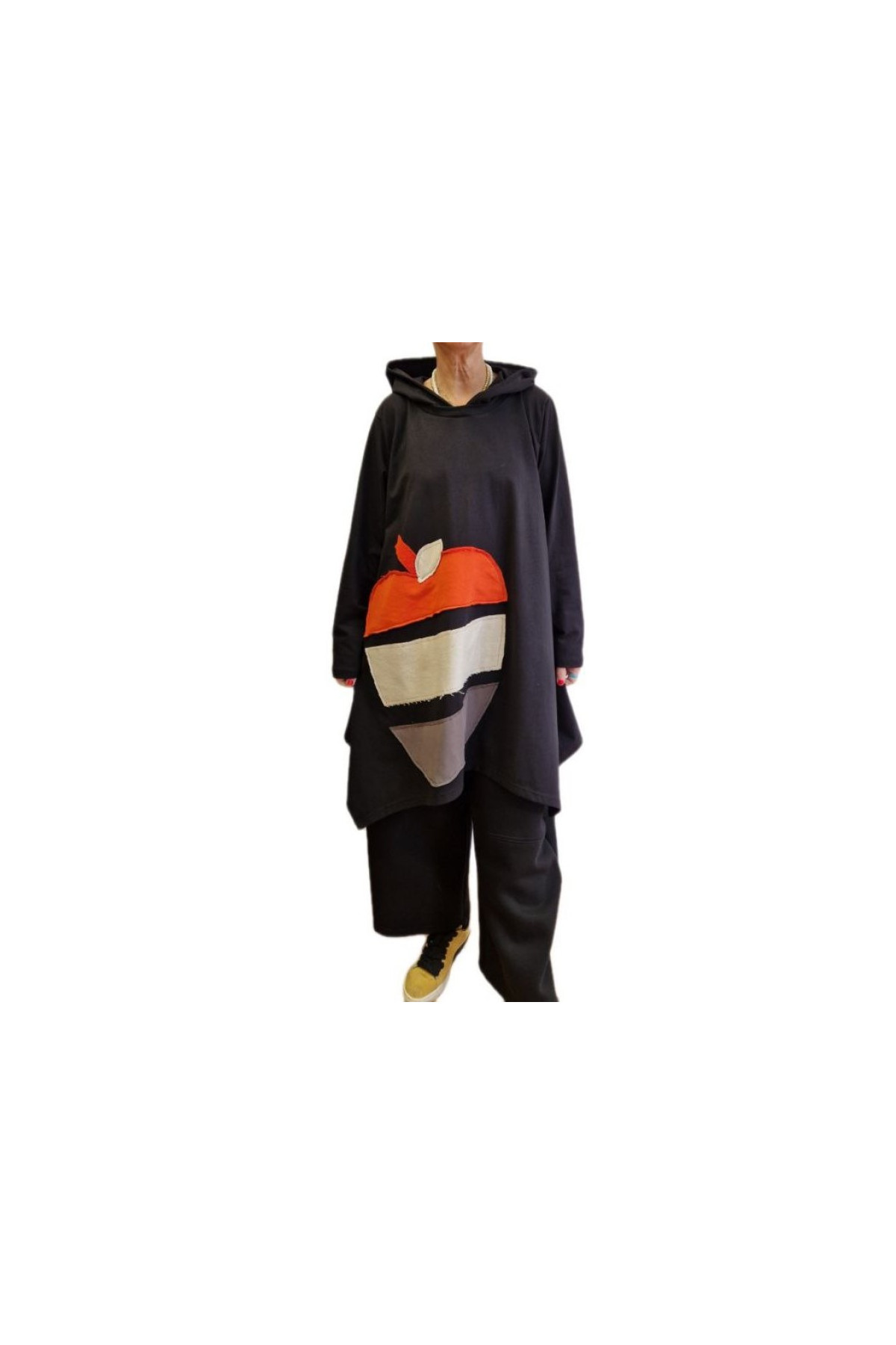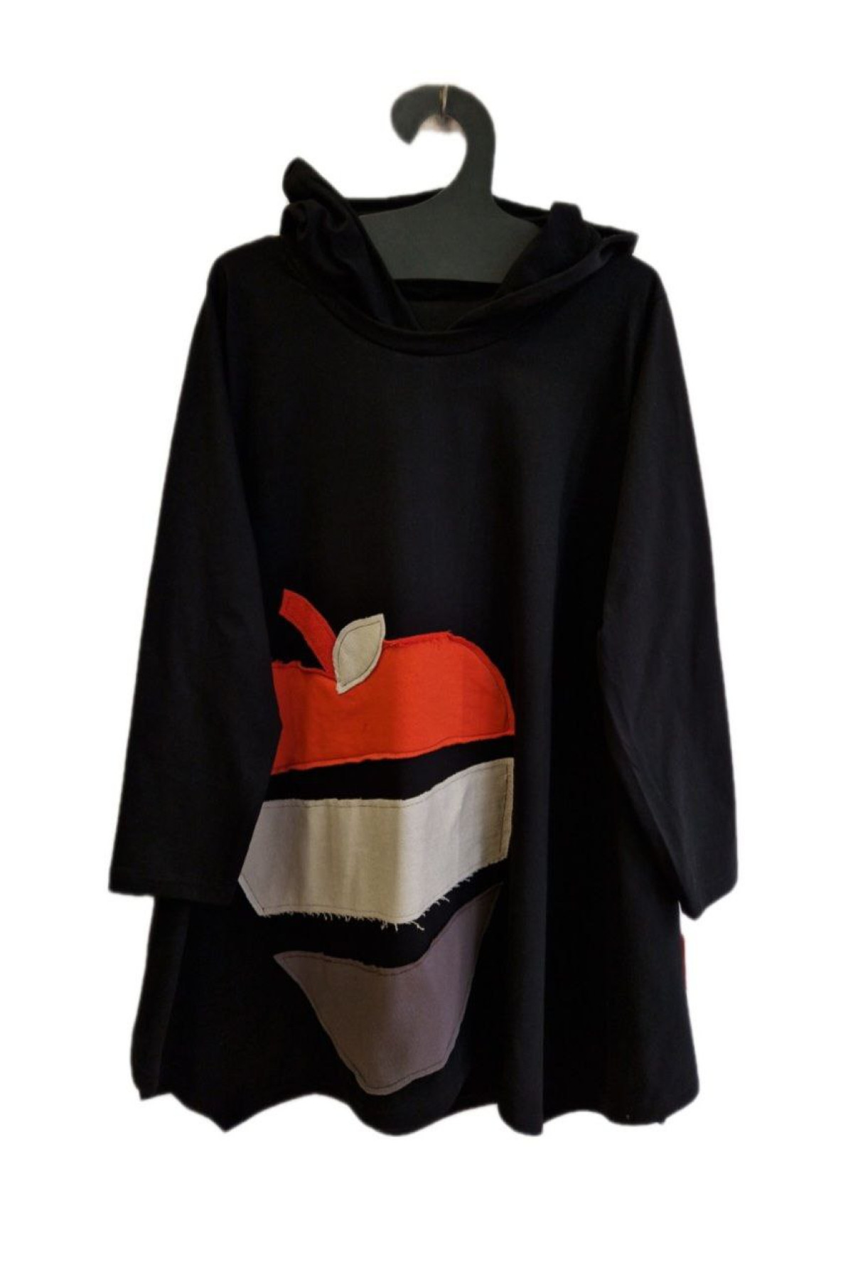 Χειροποίητο μπλουζοφόρεμα με μακρύ μανίκι και κουκούλα .Η απλικέ παράσταση είναι ένα μεγάλο μήλο στο μπροστινό μέρος του ρούχου. Ιδανική επιλογή για όλες τις ώρες της ημέρα που μπορεί να φορεθεί με καλσόν,με ένα κολάν ή τζίν παντελόνι.Μπορείτε επίσης να το φορέσετε και μια φαρδιά παντελόνα για ένα μοναδικό αποτέλεσμα. Έχει φαρδιά γραμμή και δεν διαγράφει την σιλουέτα σας.Είναι κατασκευασμένο από βαμβακερό ύφασμα.